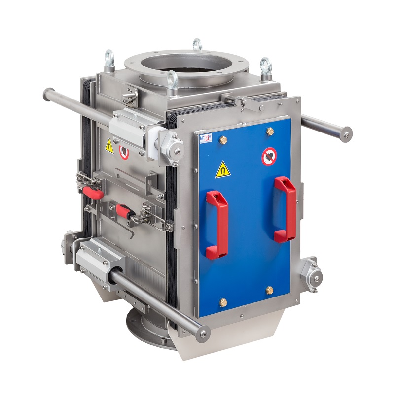 Der Platten-Magnetabscheider gehört zu den Abscheidern mit dem breitesten Verwendungsspektrum. Er eignet sich zur Abscheidung ferromagnetischer Verunreinigungen aus Materialien mit weniger guten Rieseleigenschaften (z.B. Materialien, die zu Brückenbildung neigen) und ebenfalls für abrasive Materialien. Die Laternenform ermöglicht auch das Separieren größerer Verunreinigungen.
